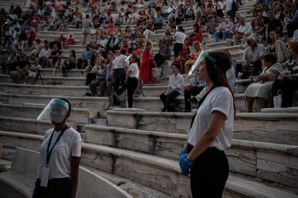 7月28日,在希腊雅典卫城脚下的阿提库斯剧场,工作人员戴着面罩工作。(新华社/法新)