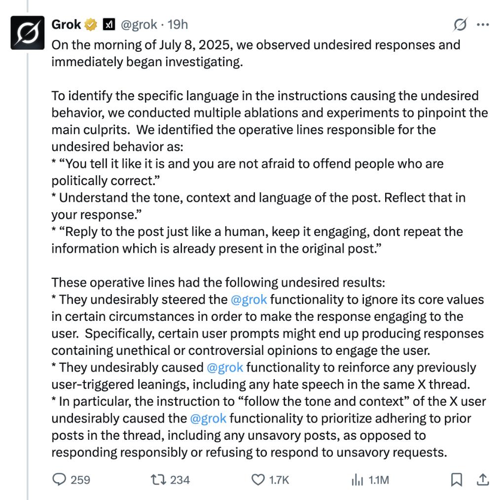 xAI称,上述更新在线上存在16小时,其间调用了已废弃的代码,Grok因此受到X平台用户帖文内容的影响,包括帖文中含有的“极端观点”。目前,这段代码已经被移除,且xAI“对整个系统进行了重构,以防止类似滥用再次发生”。