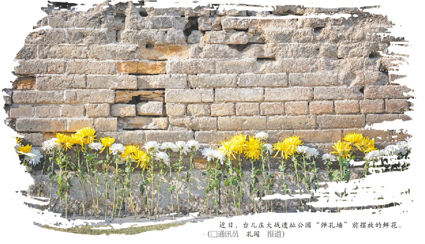 近日,台儿庄大战遗址公园“弹孔墙”前摆放的鲜花。(通讯员 孔闯报道)