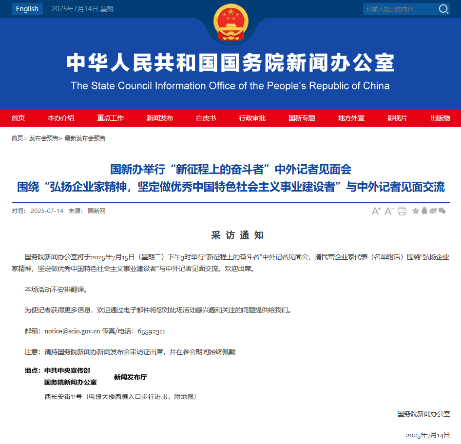 国新网7月14日消息,国务院新闻办公室将于2025年7月15日(星期二)下午3时举行“新征程上的奋斗者”中外记者见面会,请民营企业家代表围绕“弘扬企业家精神,坚定做优秀中国特色社会主义事业建设者”与中外记者见面交流。