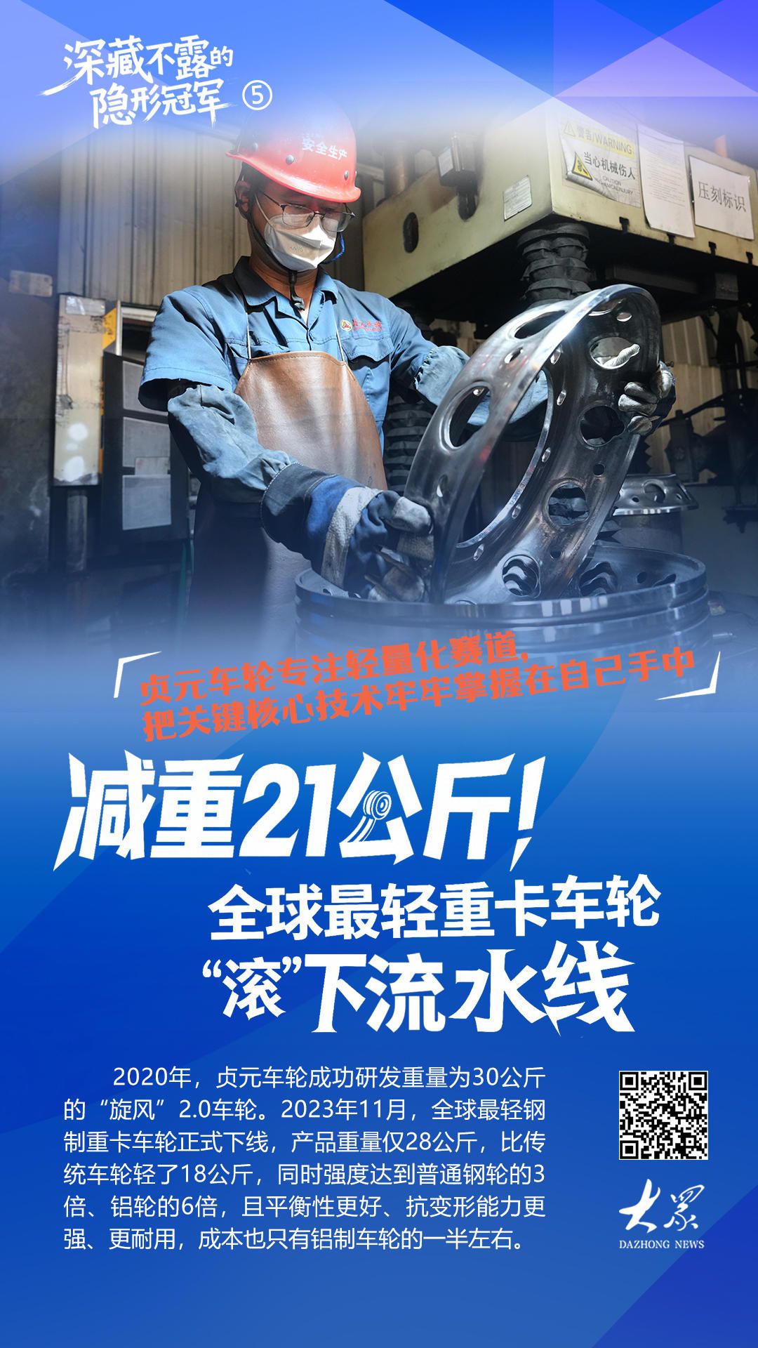 创新路上没有终点。2020年,贞元车轮成功研发重量为30公斤的“旋风”2.0车轮。2023年11月,全球最轻钢制重卡车轮正式下线,产品重量仅28公斤,比传统车轮轻了18公斤,同时强度达到普通钢轮的3倍、铝轮的6倍,且平衡性更好、抗变形能力更强、更耐用,成本也只有铝制车轮的一半左右。