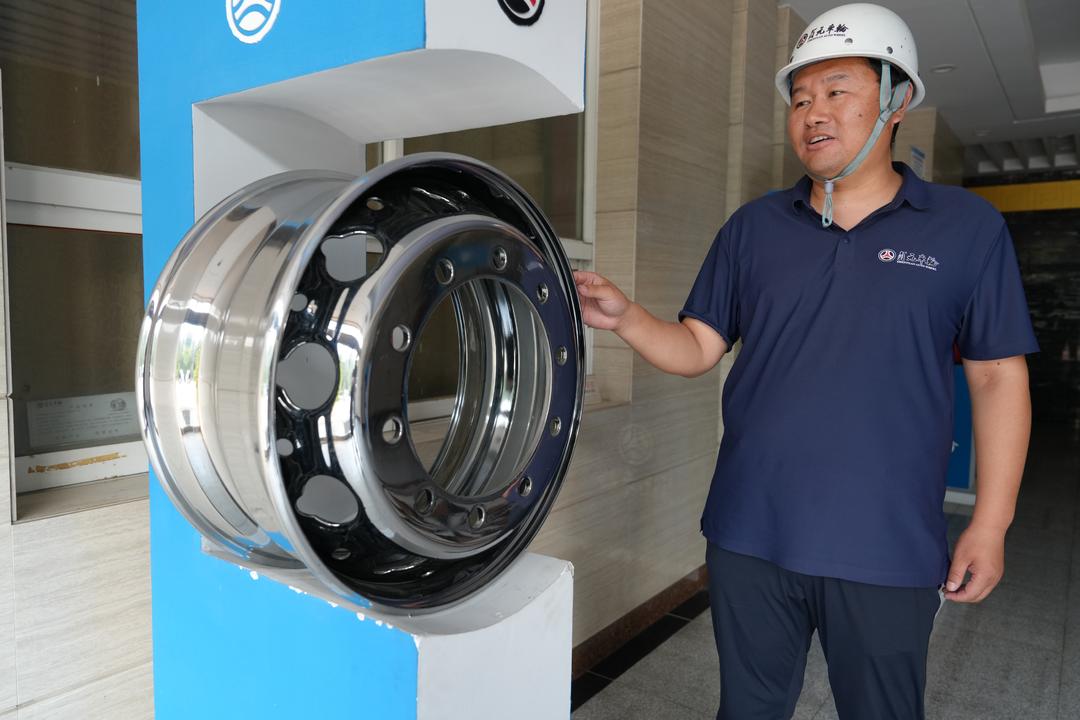 “这是我们自主研发的25公斤重轻量化车轮,也是全球最轻的钢质车轮,比46公斤标准车轮减重21公斤。”贞元车轮董事长胡爱君介绍。