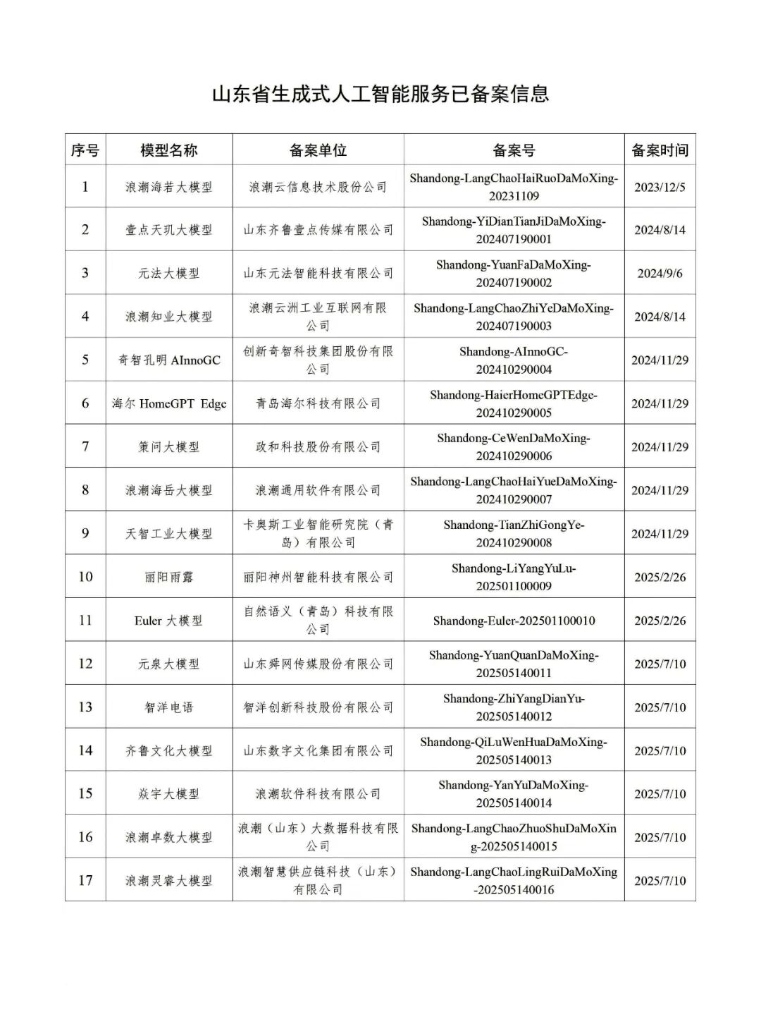 为进一步促进山东省生成式人工智能创新发展和规范应用,加快推动新质生产力发展,山东网信办会同相关部门按照《生成式人工智能服务管理暂行办法》要求,有序开展生成式人工智能服务备案工作,现将我省已备案信息予以公告。