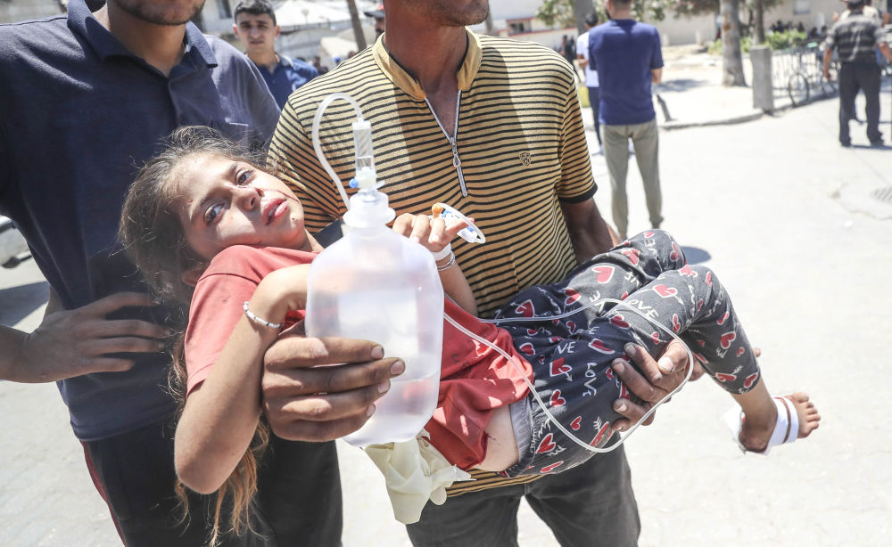7月13日,在加沙城一所医院,一名男子怀抱在以军空袭中受伤的女孩。新华社发(马哈茂德·扎基 摄)
