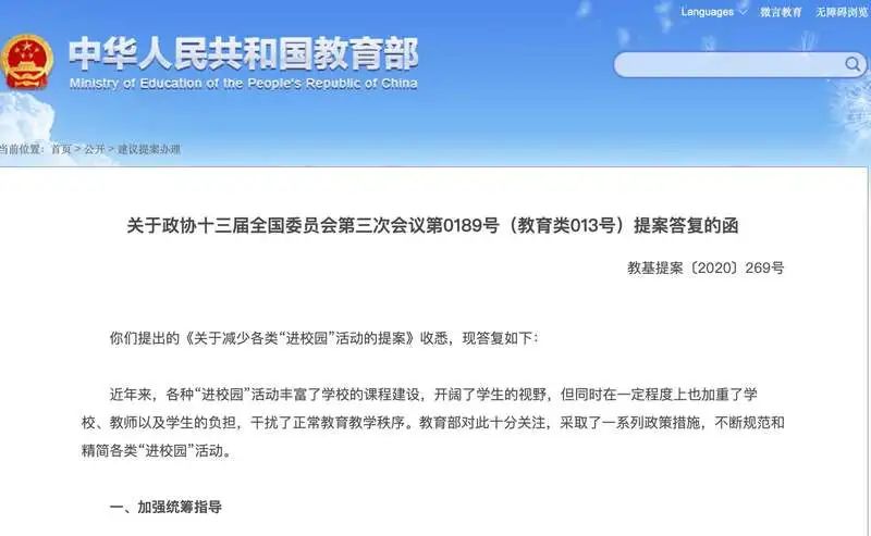 2019年6月,中共中央、国务院印发《关于深化教育教学改革全面提高义务教育质量的意见》,明确要求各地完善统筹协调机制,严格控制面向义务教育学校的各类审批、检查验收、创建评比等活动,未经当地教育部门同意,任何单位不得到学校开展有关活动。