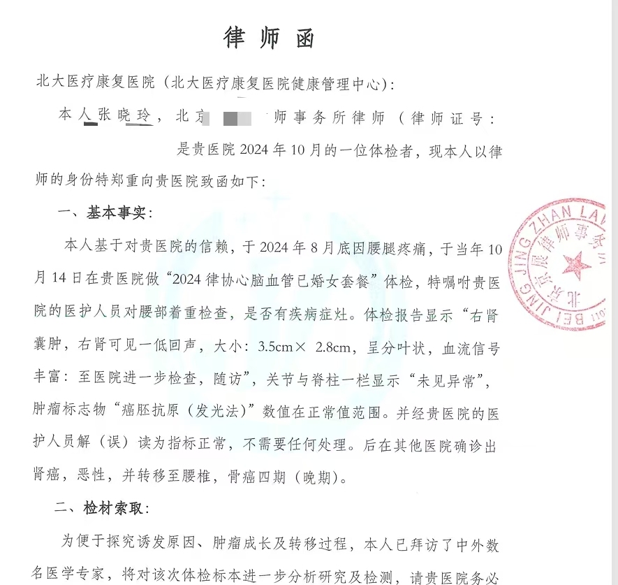 根据张晓玲提供的发给北大医疗康复医院的律师函显示,其在2024年8月底因腰腿疼痛,于当年10月14日在该医院做了体检。体检报告显示“右肾囊肿,右肾可见一低回声,随访”,关节于脊柱一栏显示“未见异常”,肿瘤标志物“癌胚抗原(发光法)”数值在正常值范围。并经医院的医护人员误读为指标正常,不需要任何处理。后在其他医院确诊出肾癌,恶性,并转移至腰椎,骨癌四期(晚期)。这封律师函的落款时间为7月4日,诉求是“为便于探究诱发原因、肿瘤成长及转移过程,本人已拜访了中外数名医学专家,将对该次体检标本进一步分析研究及检测”,请医院提供本人血液检测标本及数据、医院肿瘤标志物“癌胚抗原”技术产品的检测依据和取值等材料。
