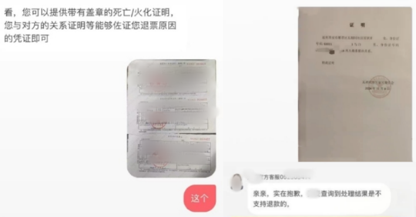 7月16日,陕西西安的白先生向媒体记者透露,他在2024年10月购买了11月3日凤凰传奇“吉祥如意”2024巡回演唱会咸阳站门票;11月2日凌晨,奶奶离世,白先生按照购票平台客服要求提供了奶奶的居民死亡医学证明(推断)书、火化证明等材料,客服仍表示“不支持退款”。