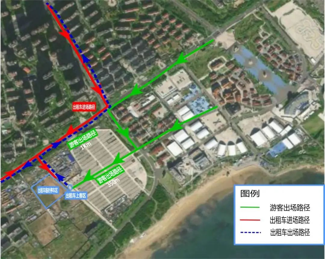 三是由金沙滩啤酒城西门出场的游客,沿P1停车场内部道路由东向西步行约350米至巡游出租车上客区。