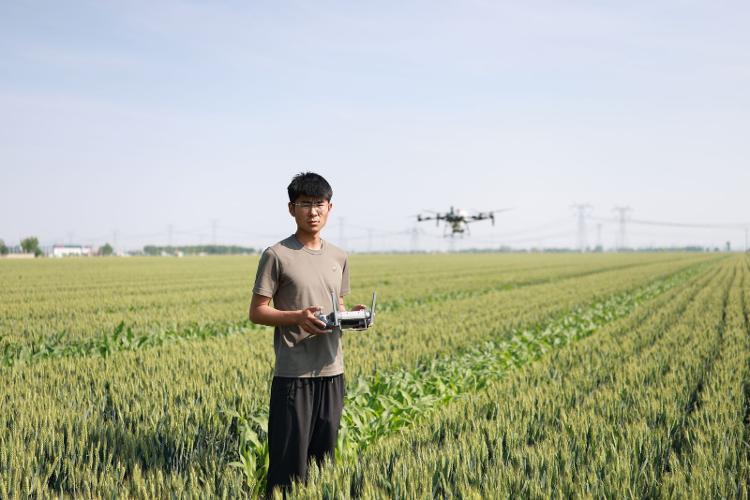 站在田埂上远眺,无人机在绿油油的农田间划出优美的航迹。李培栋掏出手机展示无人机回传的田间数据,据他介绍,这台植保无人机搭载了高精度北斗导航系统,通过AI智能航线规划,不仅能自动规划最优路径,还能通过多光谱成像进行实时监测作物长势,提前预警病虫害,推动农业生产全程机械化。