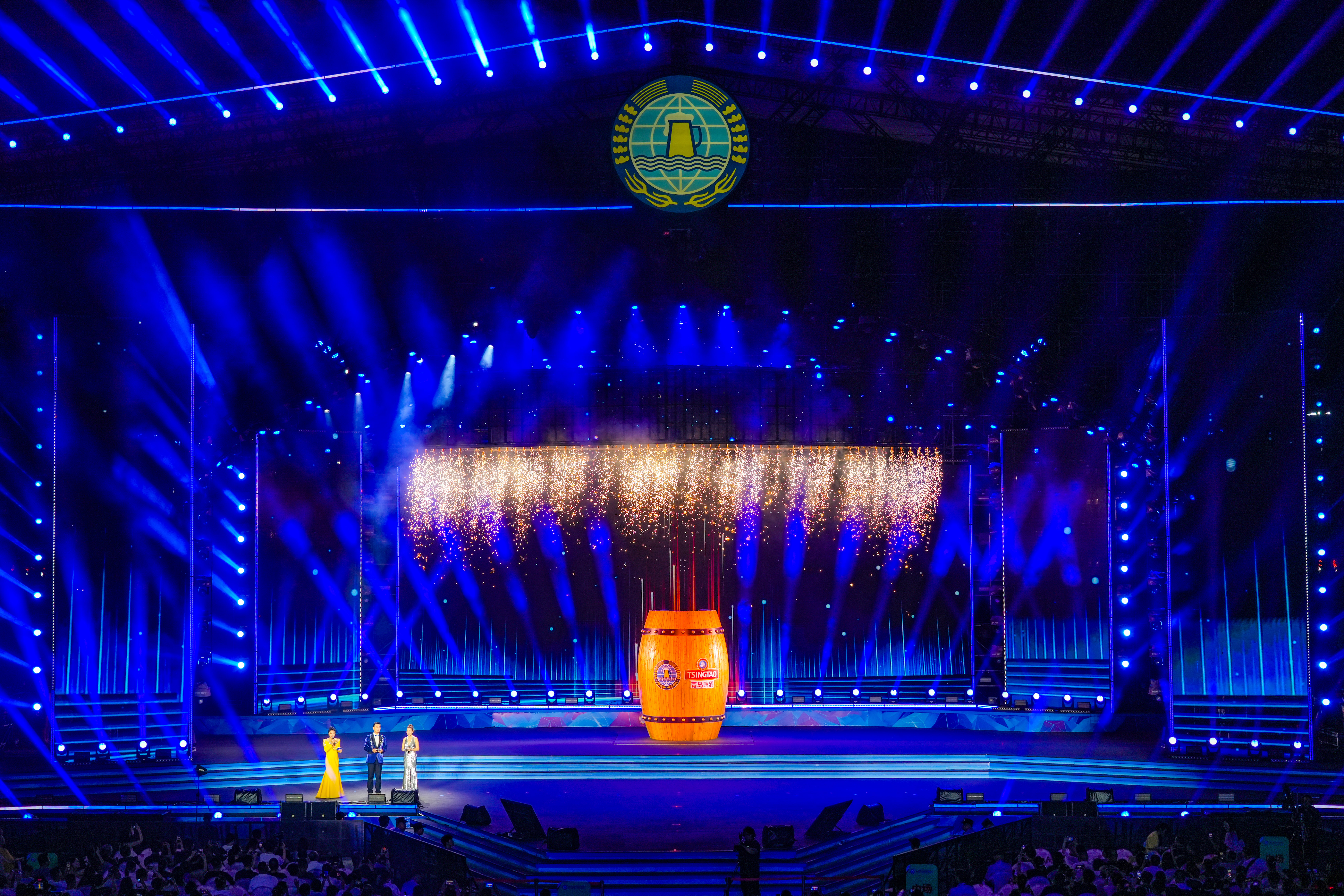 在最激动人心的“第一桶酒”开启环节,由网幕屏与裸眼3D技术精心构筑的虚拟酒桶徐徐落下,随着激昂的音乐奏响,在光影流转中化作闪耀全场的真实啤酒桶,虚拟与现实交织、科技与艺术结合,每一帧如同梦幻画面在现场观众的眼前铺展,犹如上演了一场大型舞台魔术秀。随后,出席领导、嘉宾、行业代表共同开启第35届青岛国际啤酒节第一桶啤酒,并举杯向世界发出邀约。绚烂的礼花在天际绽放之时,金沙滩啤酒城化作一片欢乐的海洋,将开幕式推向高潮。