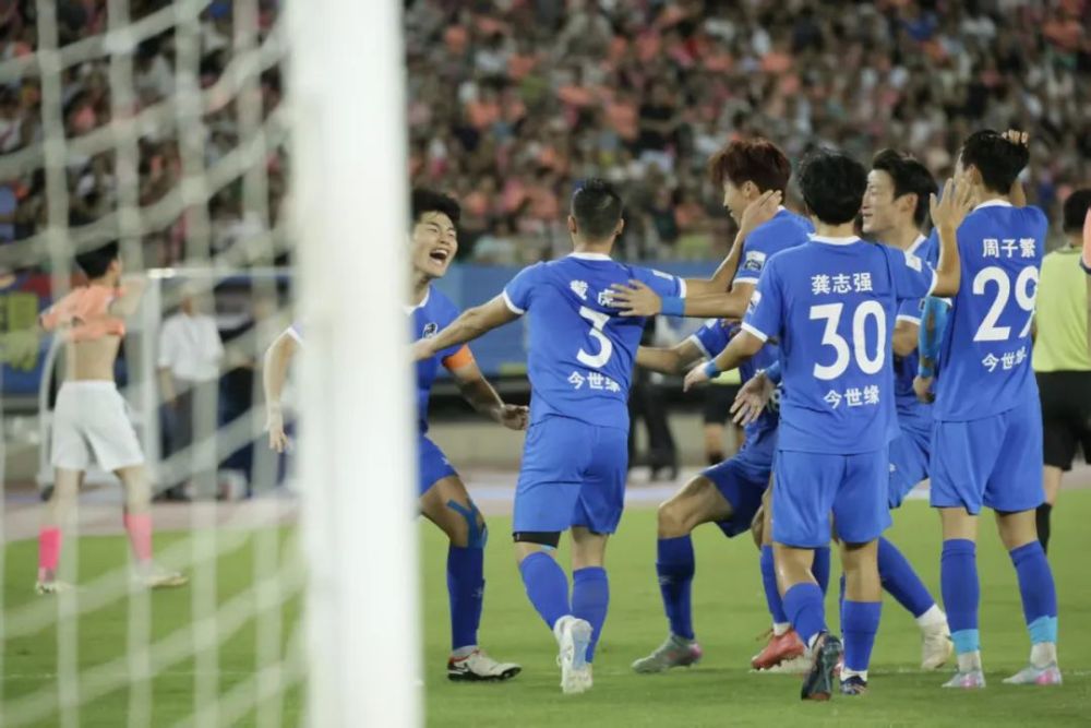 帮助淮安队打进第二球的戴虎在与队友庆祝。图片来自淮安发布