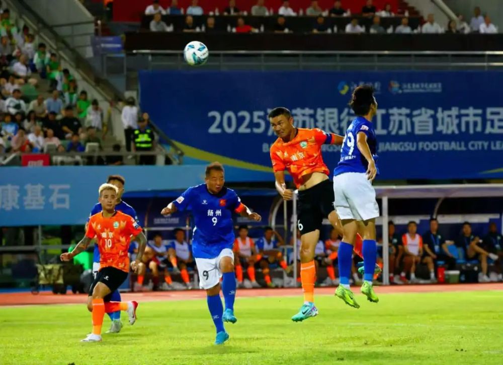 南京队与扬州队的比赛开局仅三分钟,戈伟(右二)就头球破门。图片来自南京发布