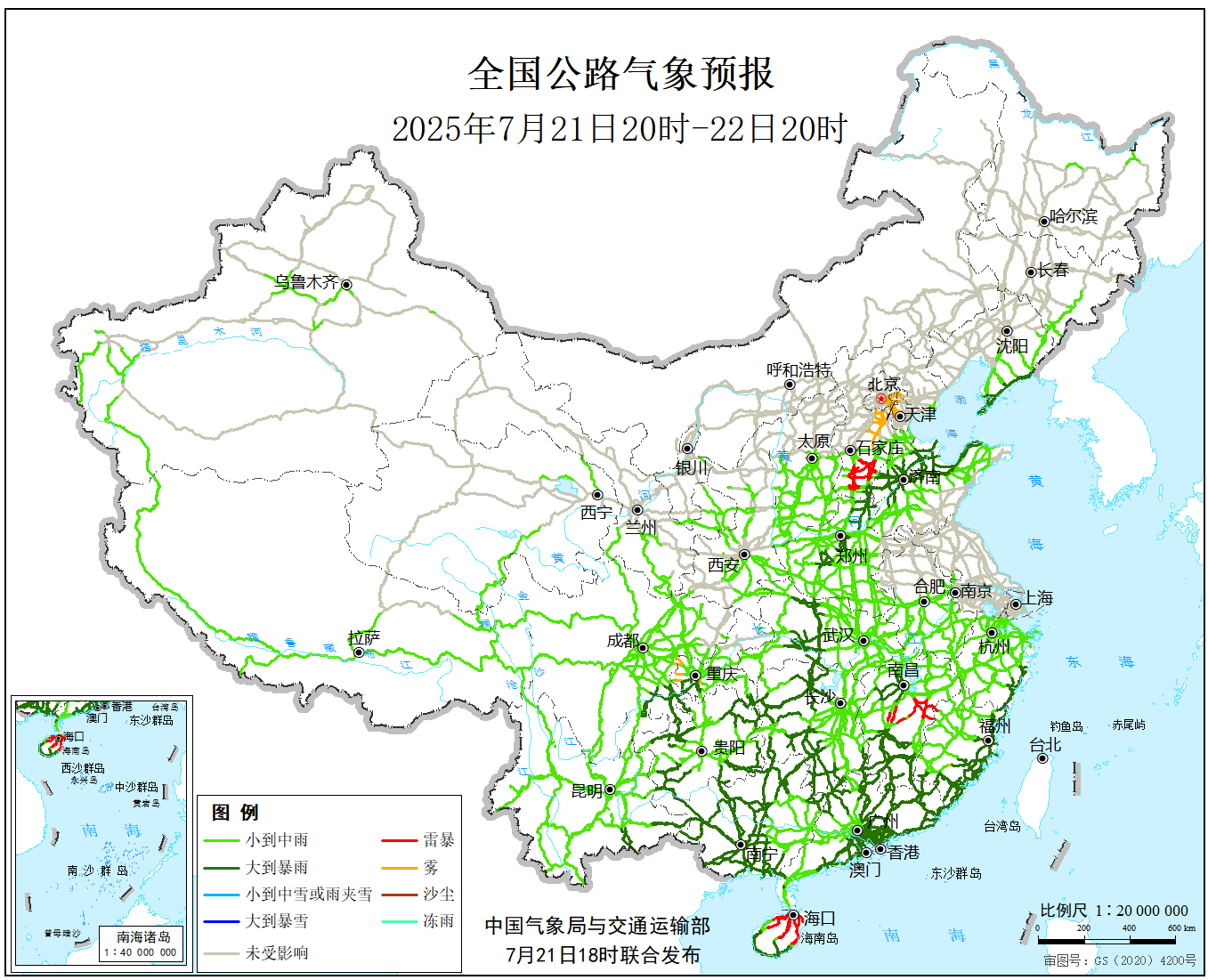 7月21日20时至22日20时,福建东部和南部、广东中东部和南部、海南岛西部和南部、广西大部、云南东南部以及贵州大部、四川盆地南部、重庆南部、湖北西部、湖南中西部、江西西部和南部、浙江东南部、河南中部、山东北部、辽宁东南部等地的部分地区有大到暴雨,其中广东南部沿海、广西南部、福建东部沿海、山东东北部等地的局部地区有大暴雨。上述部分地区伴有短时强降水,局地有雷暴大风等强对流天气。另外,天津北部、河北中部、重庆西南部等地局地有雾。