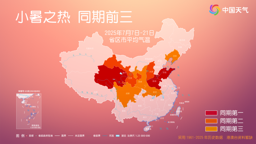 统计数据显示,今年小暑节气期间全国平均气温达23.75℃,为1961年有完整气象观测数据以来最热的小暑节气。而在各省区市平均气温中,山东、河南、青海都经历了最热的小暑,山西、甘肃则是同期第二热。
