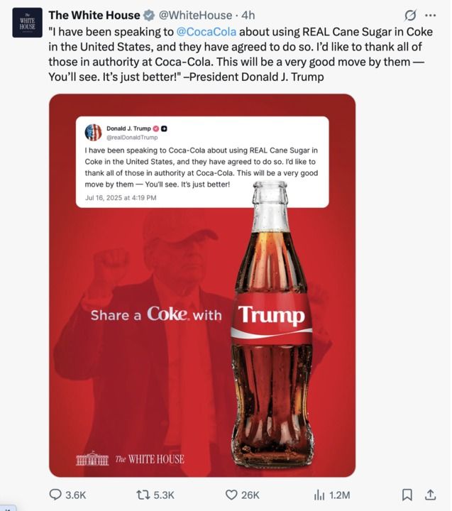 白宫社交媒体账号转发特朗普关于让在美销售可口可乐使用蔗糖帖文的截图。
