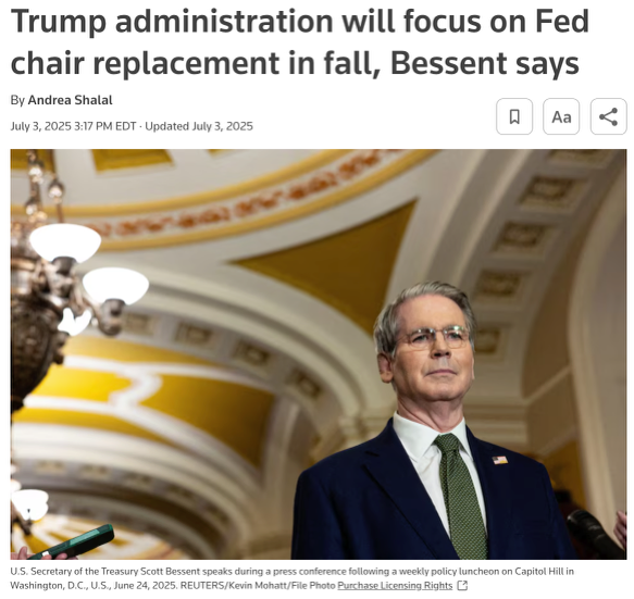 △路透社报道,财长贝森特表示,接下来会特别关注美联储的人事更替