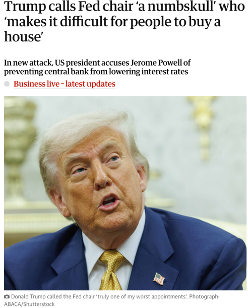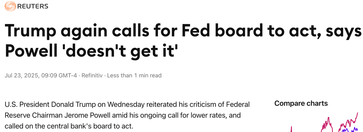 这已经是本月内特朗普第三次在公开场合点名抨击鲍威尔。自7月初以来,特朗普已在多场演讲、采访和社交平台上,频繁就利率政策发表批评性言论,尽管多数未明确提及鲍威尔本人,但指向美联储货币政策的不满已十分明显。
