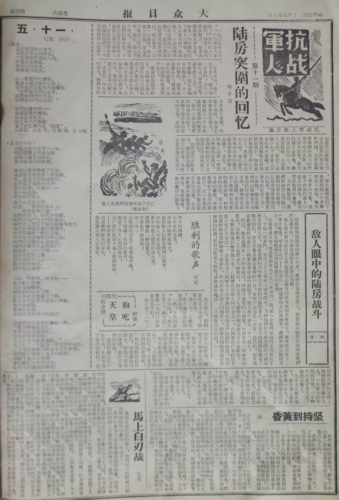 1941年5月10日,陆房突围战斗即将两周年之际,《大众日报》又于第四版刊发了陆房突围战斗的相关内容。此次,报纸用了一个整版来呈现陆房突围相关情况,不仅刊有详细记录陆房突围过程的《陆房突围的回忆》《马上白刃战》《坚持到黄昏》等文章,还刊有从被俘日军视角看待陆房突围战斗的《敌人眼中的陆房战斗》、突围后的余闻《狗吃天皇》,以及两篇歌颂陆房突围胜利的诗歌《胜利的歌声》《五·十一》。此外,版面还配有一张木版画《敌人在我们英勇冲锋下灭亡》。