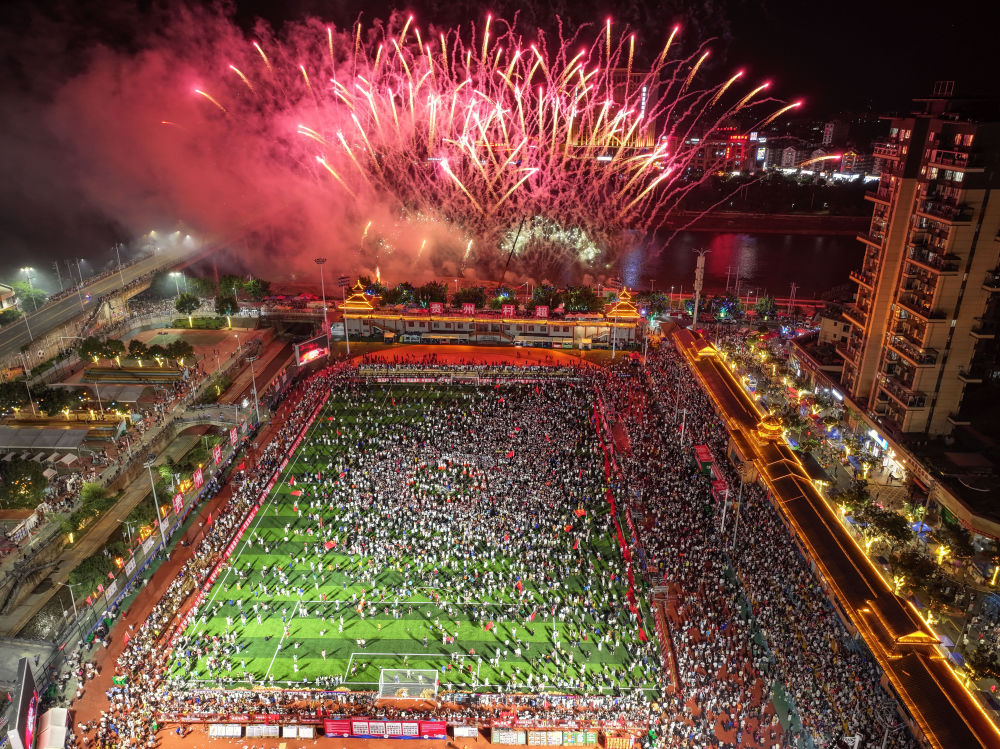 这是7月26日在贵州“村超”球场拍摄的烟花秀(无人机照片)。新华社记者 杨文斌 摄