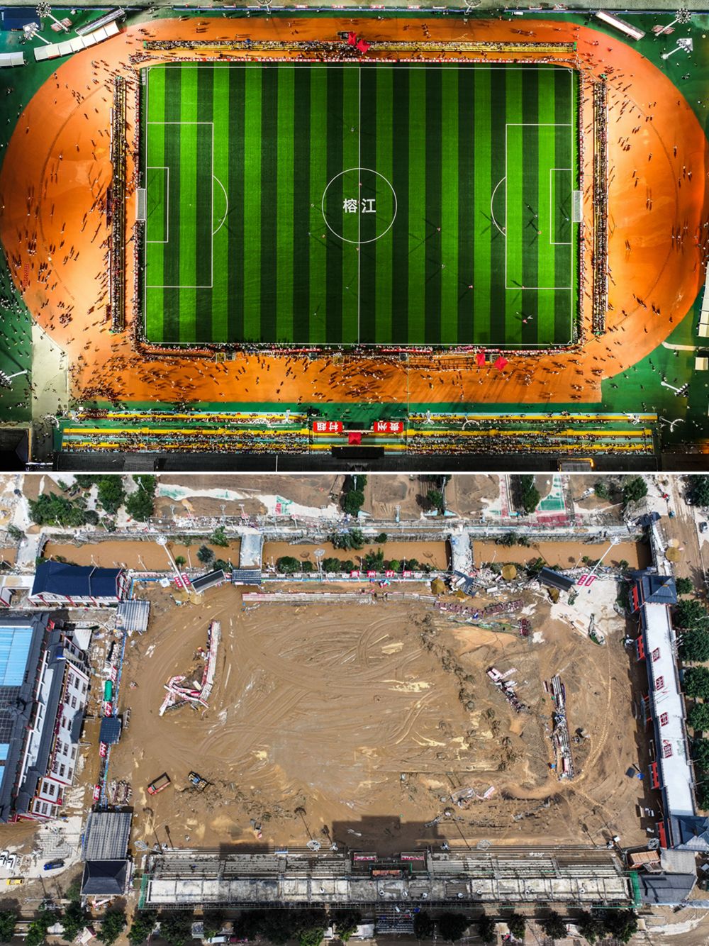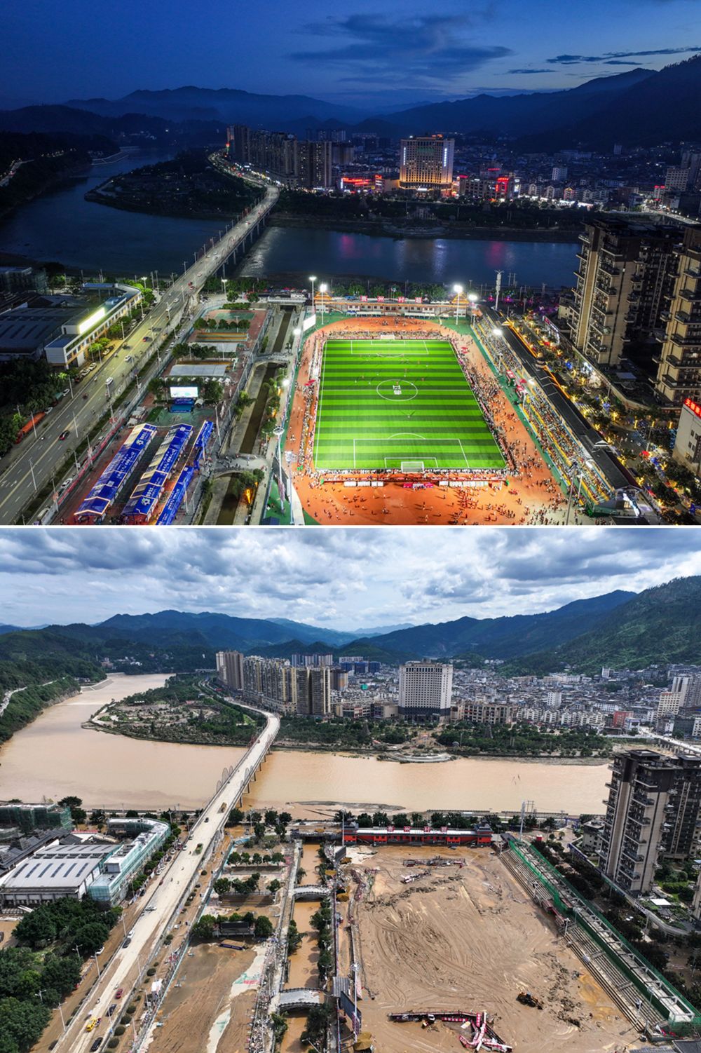 拼版照片:上图为7月25日在贵州榕江拍摄的灾后重建后的“村超”球场(无人机照片);下图为6月25日在贵州榕江拍摄的遭受洪水袭击的“村超”球场(无人机照片)。新华社记者 杨文斌 摄