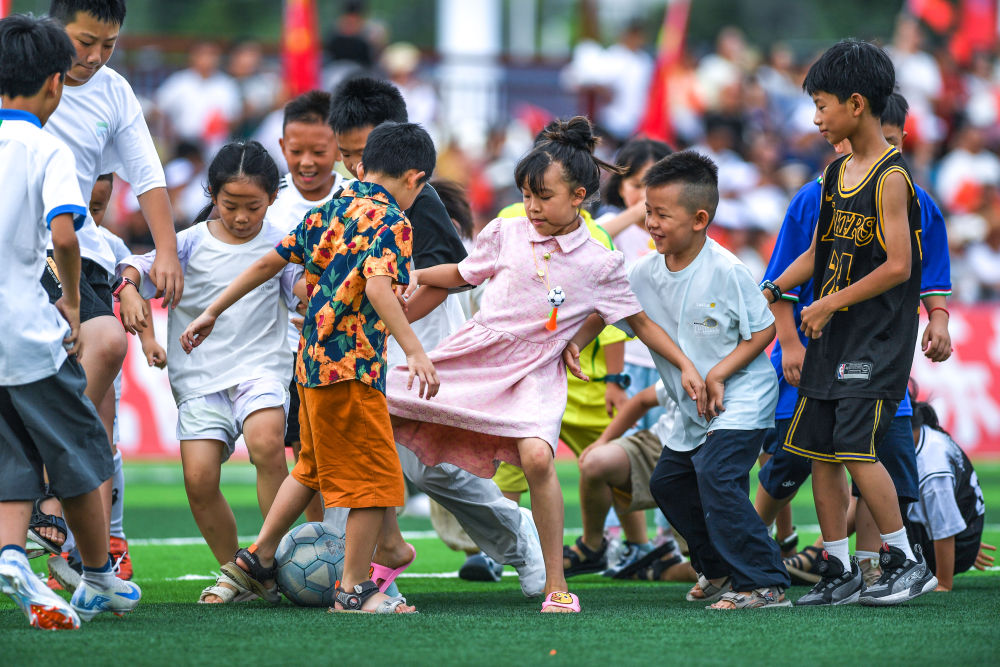 7月26日,孩子们在“村超”球场比赛间隙踢球。 新华社记者 杨文斌 摄