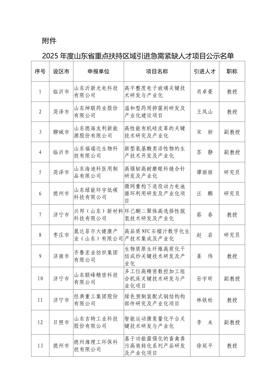根据《山东省重点扶持区域引进急需紧缺人才项目管理办法》(鲁发改动能办〔2023〕539号)规定,省发展改革委组织开展了2025年度山东省重点扶持区域引进急需紧缺人才项目遴选工作。经申报、初审、会评等程序,研究提出了2025年度山东省重点扶持区域引进急需紧缺人才项目名单,现予公示。如有异议,可向省发展改革委反映情况,联系电话:0531-51783250。