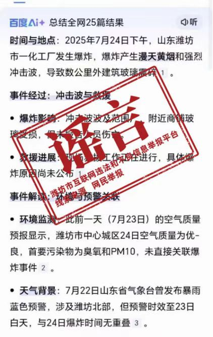 近日,有网民引用AI生成文章称“2025年7月24日潍坊发生爆炸事故”。