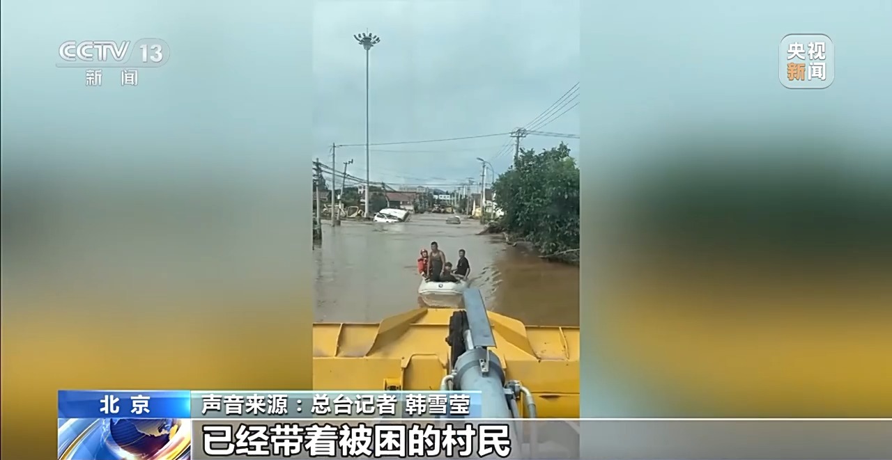总台记者 韩雪莹:从这辆铲车上卸下去的消防救援冲锋舟,已经带着被困的村民即将回到铲车上。