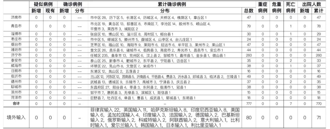 山东无新增本地疑似病例、确诊病例。累计报告确诊病例777例,死亡7例,治愈出院770例。