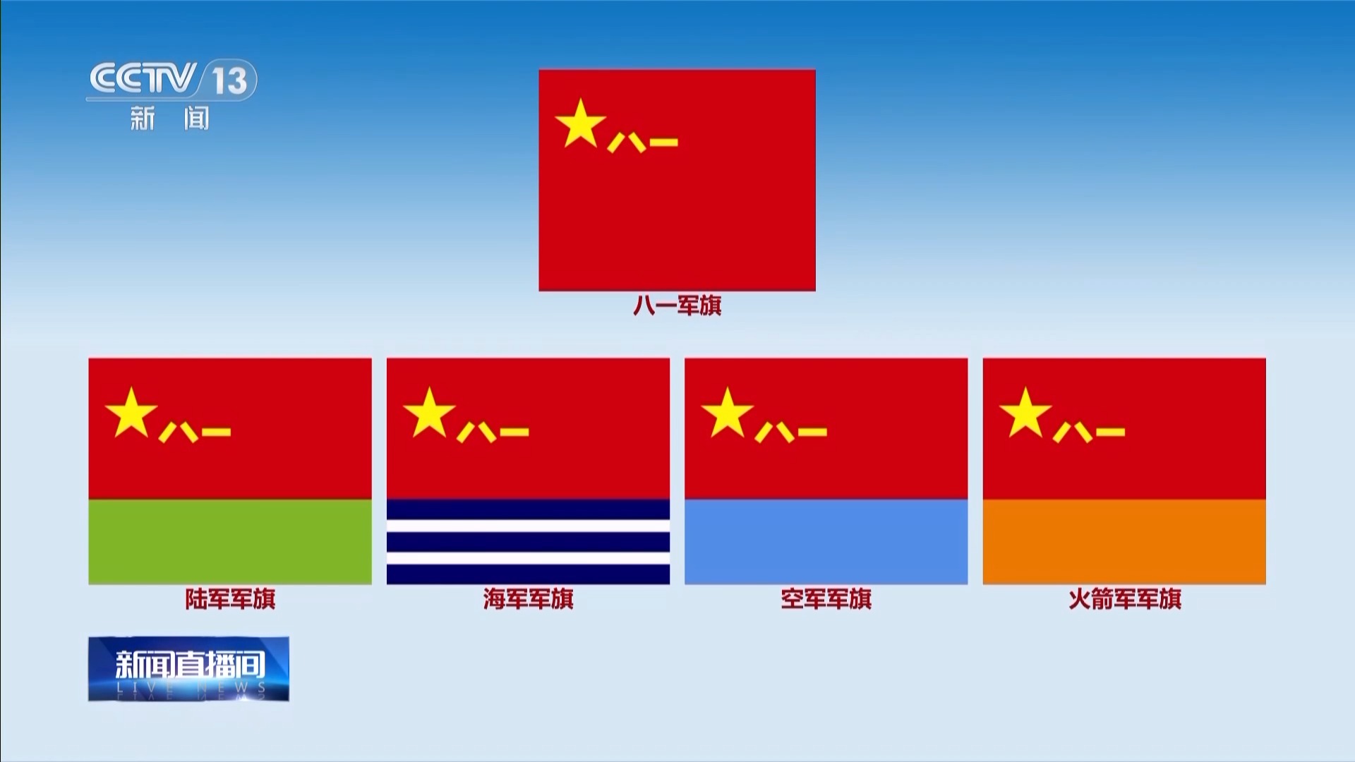 陆军军旗草绿色,象征绿色的大地;海军军旗蓝白条相间,象征大海与海浪;空军军旗天蓝色,象征辽阔的蓝天;火箭军军旗橙黄色,象征导弹点火腾飞时喷出的烈焰——4面军种军旗,风格简洁、大气庄重。