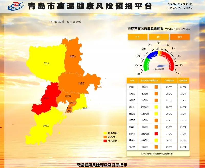青岛日报社/观海新闻8月3日讯 今天,观海新闻记者从新升级后的青岛市疾控中心高温健康风险预报平台上了解到,预计8月3日20时至8月4日20时,胶州市高温健康风险极高(红色);市南区、市北区、李沧区、城阳区、即墨区和莱西市高温健康风险高(橙色),其余地区高温健康风险较高(黄色)。市民请及时关注预报信息变化,保持室内凉爽,避开高温时段外出,减少户外活动,保证充足饮水。老人、孕妇、儿童、慢性病患者应加强对自身健康状况的关注,如出现身体不适,应及时就医。户外作业者要注意防暑降温。