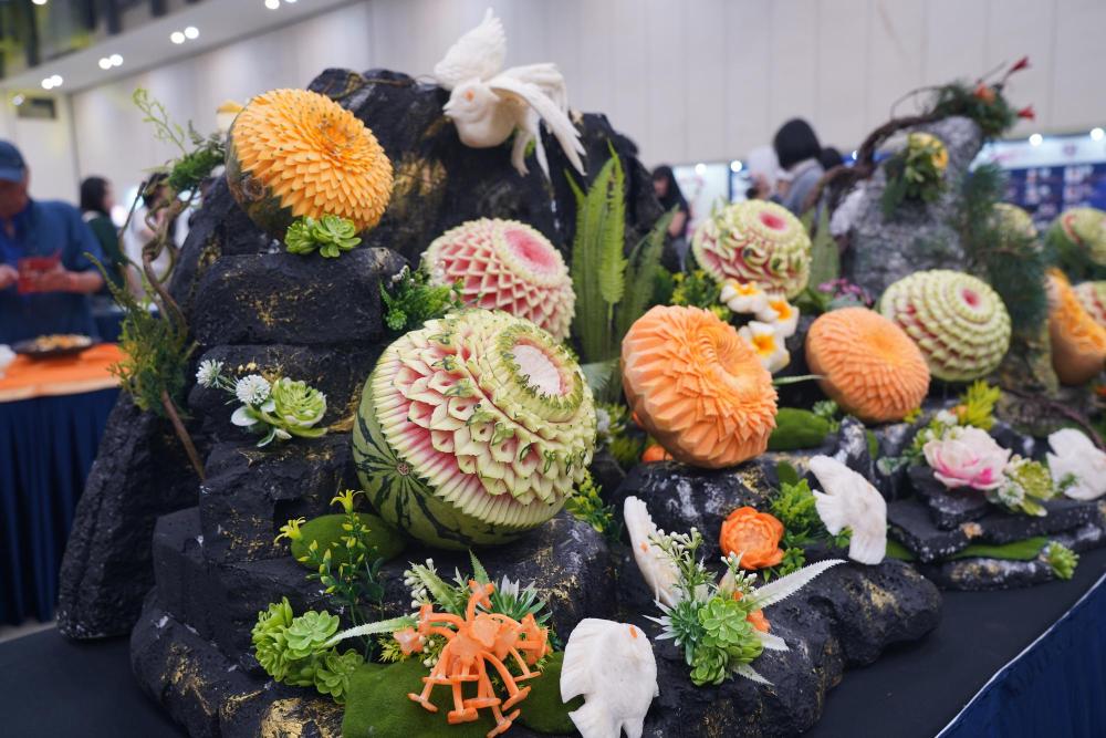 这是2024年10月6日在韩国釜山举行的第21届釜山国际美食博览会上拍摄的使用西瓜、南瓜等食材制作的雕刻作品。新华社发(孙一然摄)