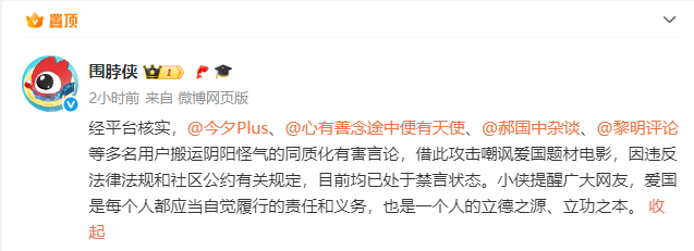 8月4日,微博社区观察员官方账号@围脖侠 发文称处置多名攻击爱国题材电影账号: