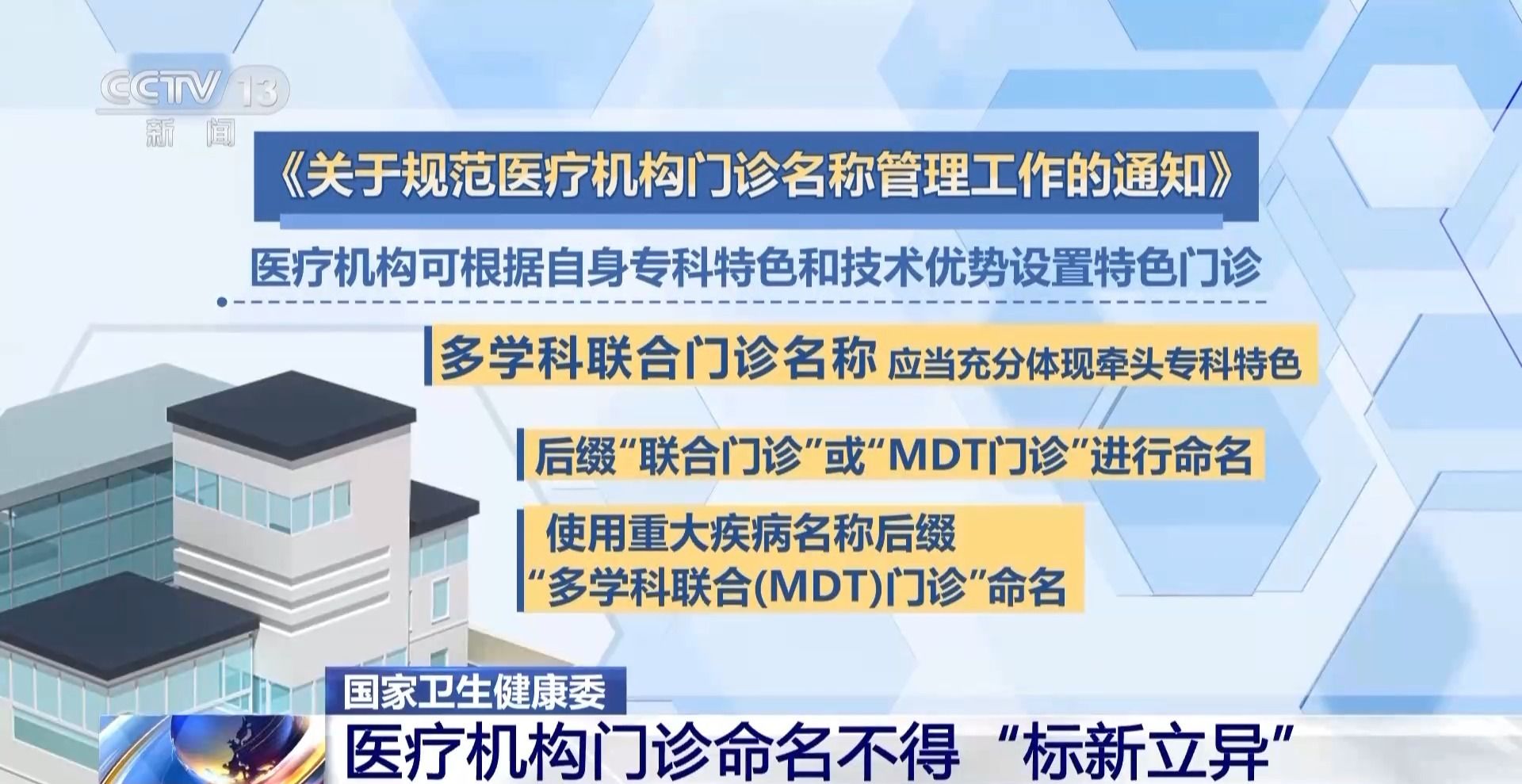 针对部分医疗机构使用模糊、笼统或容易混淆的门诊名称,少数医疗机构为吸引患者,利用谐音、形容词等暗示疗效的门诊名称误导患者等情况,国家卫生健康委近日发布了《关于规范医疗机构门诊名称管理工作的通知》,强调医疗机构要遵循依法合规、科学规范、清晰准确的原则进行门诊命名。
