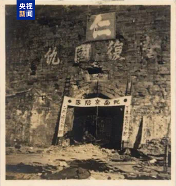 △日军侵占南京后,在中华门挂上了“祝南京陷落”等大幅标语