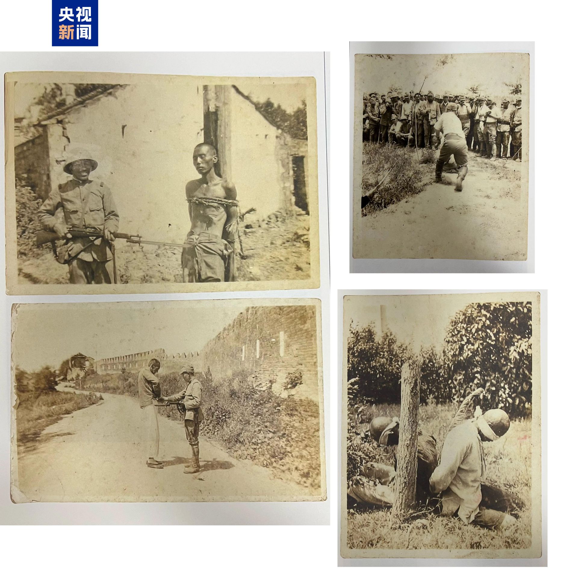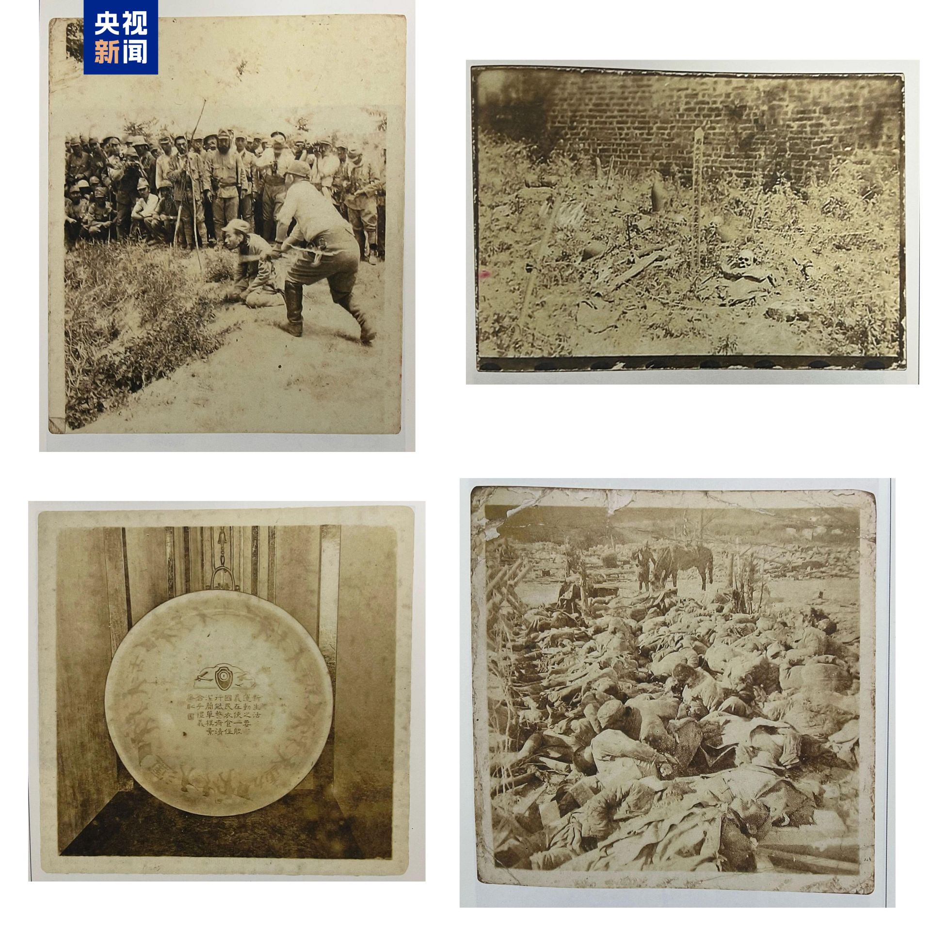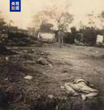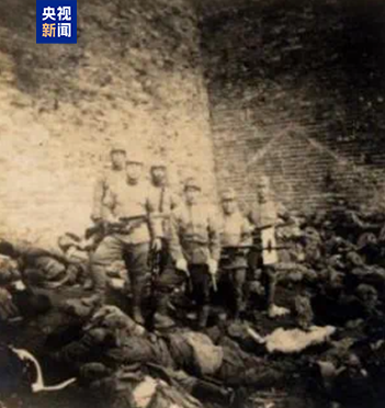 日军士兵手持步枪、刺刀和日本旗,站在中国人的尸体旁炫耀;紫金山下被日军屠杀的中国人尸体堆积如山;日军在中华门悬挂“祝南京陷落”等大幅标语……