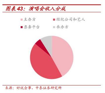 中泰证券近期发布报告显示,在整个演唱会票房收入中,主办方的分成比例大致在40%-45%,经纪公司和艺人分成约占42%-47%,票务平台分成在3%-8%之间,而场馆等承办方则以固定租金为主,占比约为8%-10%。
