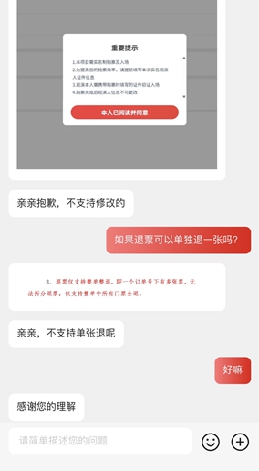 平台客服回应称,购票页面已明确标注:“为防止恶意购退票扰乱销售秩序,所有退票仅支持整单整退。”苏女士对此表示不解:“我并非恶意退票,只是身体原因无法出行,为什么不能退我自己的那张票?”