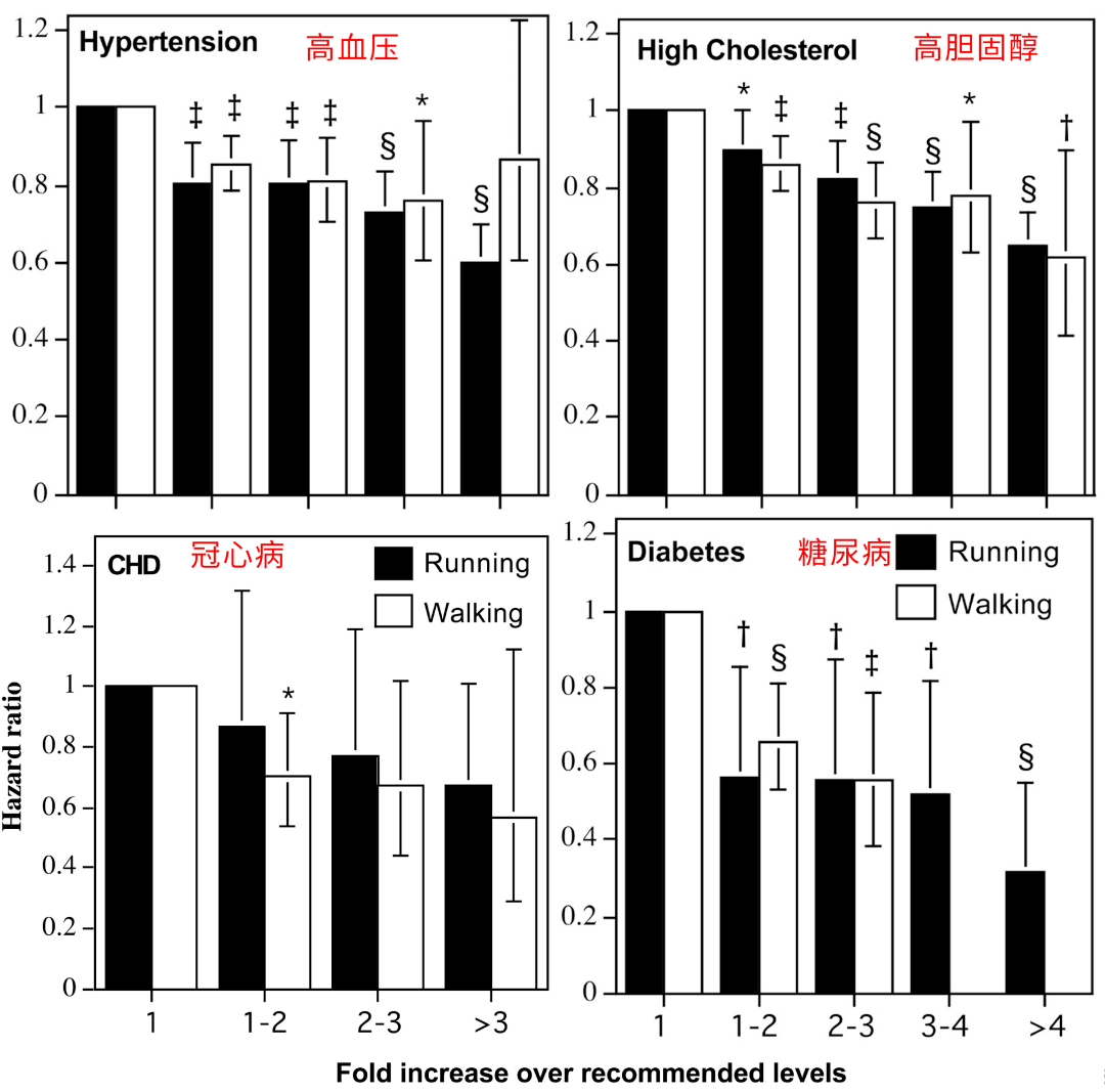 跑步:可以使高血压风险降低4.2%,高胆固醇风险降低4.3%,2型糖尿病风险降低12.1%,冠心病风险降低4.5%。