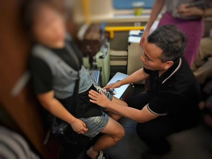 顾不得连日来奔波的疲惫,戴世友与同事宋文联快速起身,穿过两节车厢,第一时间来到突发急症患者身旁。