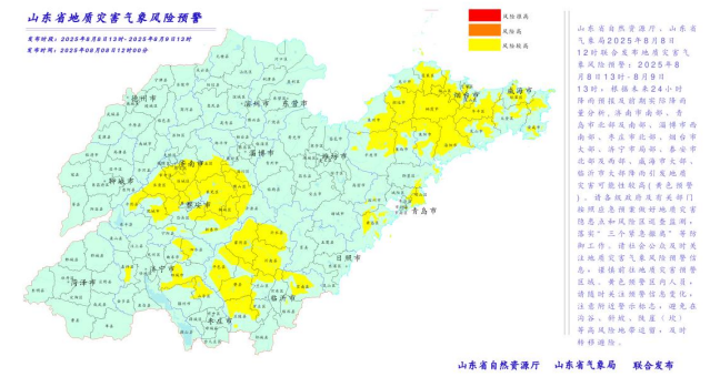 山东省自然资源厅和山东省气象局2025年8月8日12时50分联合发布山东省地质灾害气象风险黄色预警: