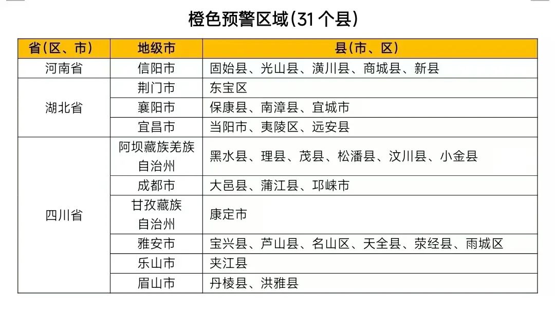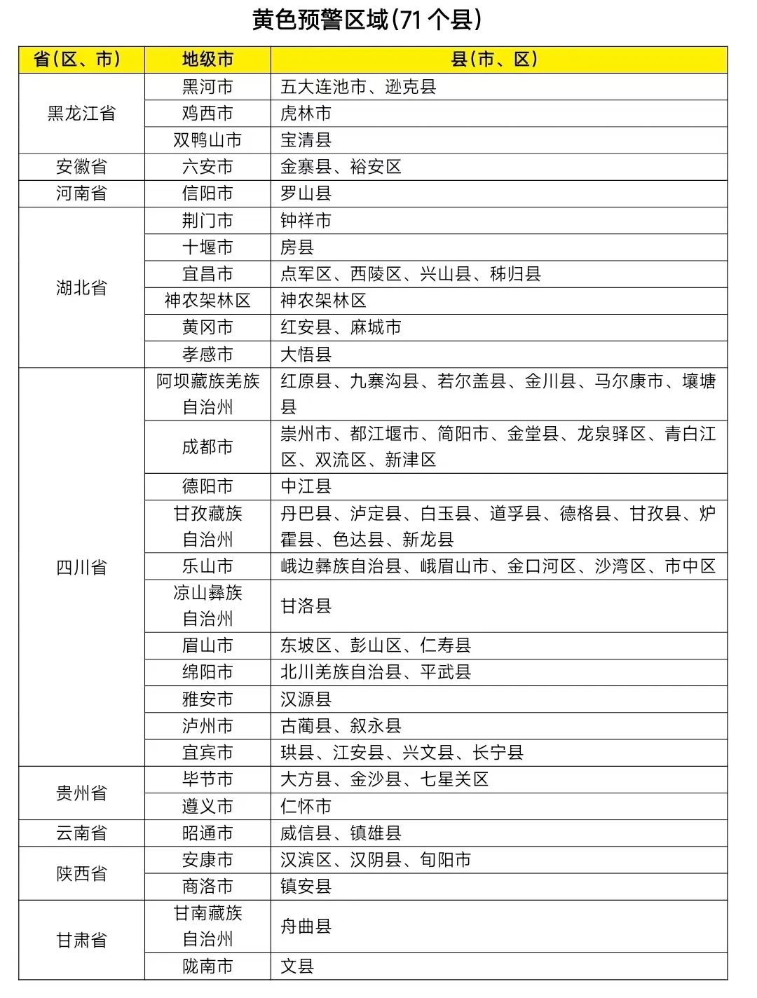 预计,8月9日20时至8月10日20时,黑龙江东部和北部、安徽西部、河南南部、湖北中部和东部、四川中北部和东南部、贵州西部、云南东北部、陕西南部、甘肃南部等地部分地区发生山洪灾害可能性较大(黄色预警),其中,河南南部、湖北中部、四川中部局地发生山洪灾害可能性大(橙色预警),预警区域涉及的县(市、区)见下表。其他地区也可能因局地短历时强降水引发山洪灾害,请各地注意做好实时监测、防汛预警和转移避险等防范工作。
