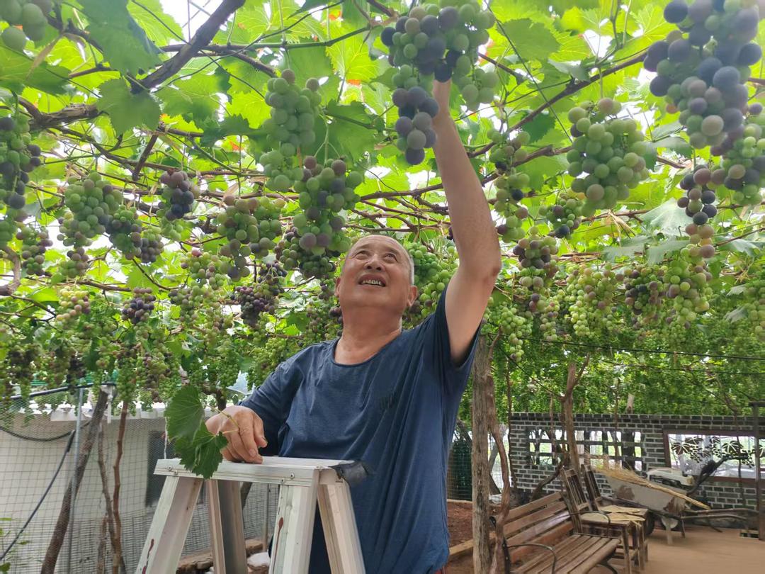 夏日升腾,阳光穿透层叠枝叶,枣庄市山亭区北庄镇洪门村的葡萄架下响起沙沙声。