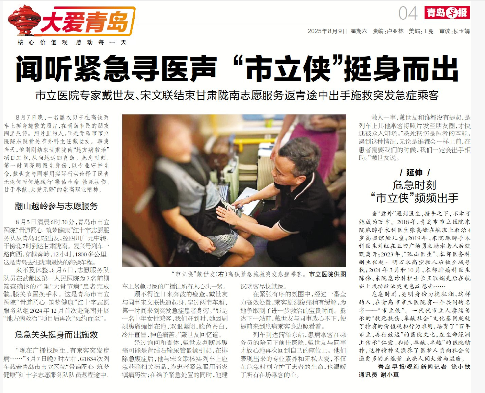 一次偶然的相遇,一场专业的救援,在这场没有硝烟的生命保卫战中,张文静彰显了市立医院“白衣天使”的职业担当。而“市立侠”的身影无处不在,就在8月7日,青岛市市立医院东院骨关节外科主任戴世友结束甘肃陇南“地方病救治”项目工作,乘坐高铁从当地返回青岛。途中听到列车上紧急寻医的广播,顾不得连日来奔波的疲惫,戴世友与同事宋文联快速起身,穿过两节车厢,第一时间来到突发急症患者身旁。在紧张有序的氛围中,经过一番全力高效处置,乘客剧烈腹痛稍有缓解,为进一步救治争取到了宝贵时间。“救死扶伤是医者的本能,遇到这种情况,无论是谁都会一样上前,在患者需要我们的时候,我们一定会出手相助。”戴世友说。
