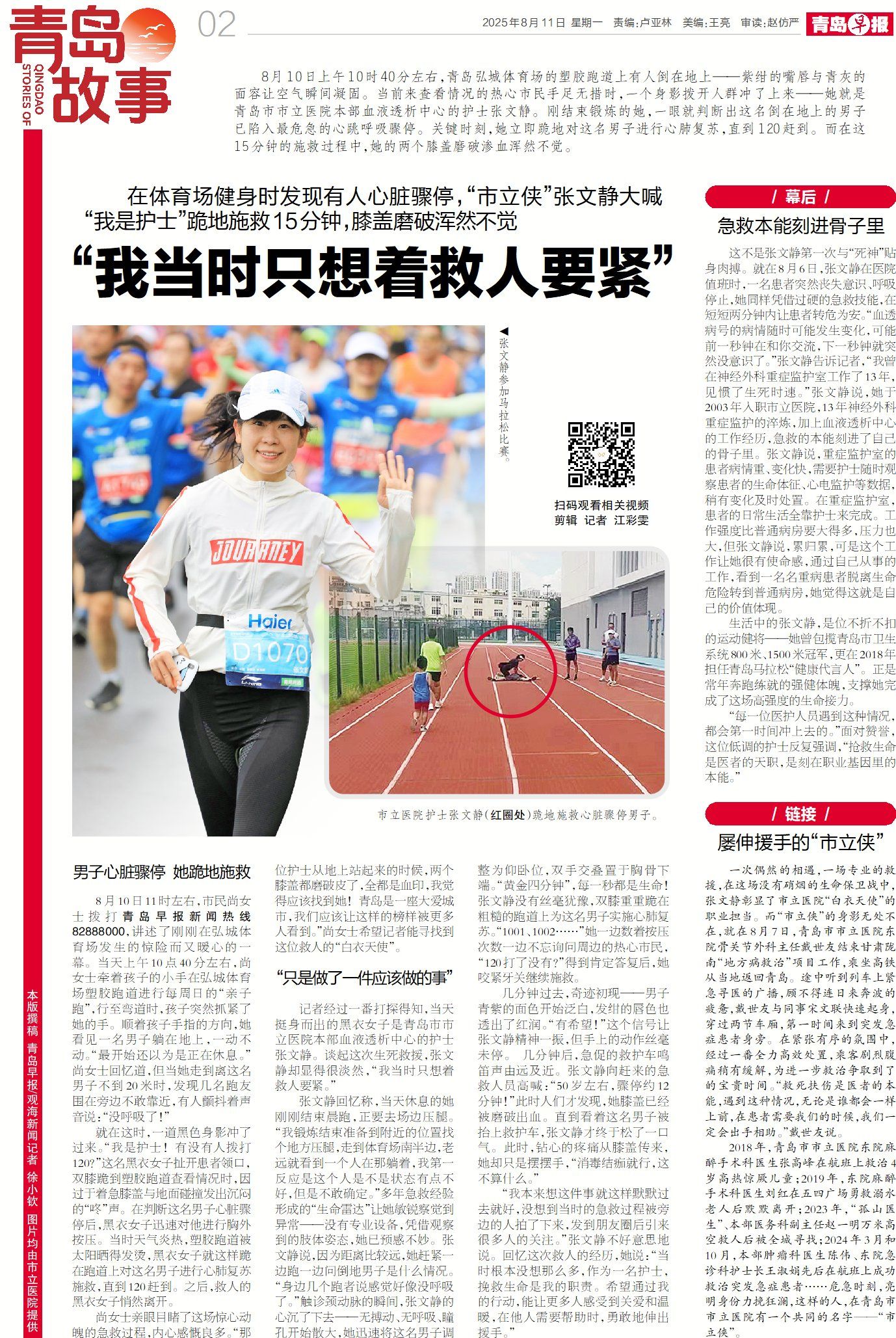 8月10日上午10时40分左右,青岛弘诚体育场的塑胶跑道上有人倒在地上——紫绀的嘴唇与青灰的面容让空气瞬间凝固。当前来查看情况的热心市民手足无措时,一个身影拨开人群冲了上来——她就是青岛市市立医院本部血液透析中心的护士张文静。刚结束锻炼的她,一眼就判断出这名倒在地上的男子已陷入最危急的心跳呼吸骤停。关键时刻,她立即跪地对这名男子进行心肺复苏,直到120赶到。而在这15分钟的施救过程中,她的两个膝盖磨破渗血浑然不觉。