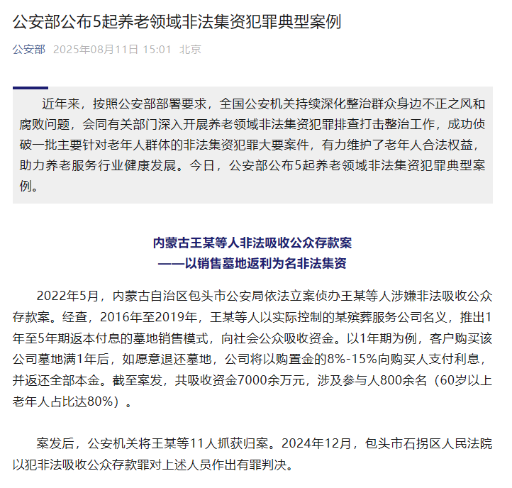 近年来,按照公安部部署要求,全国公安机关持续深化整治群众身边不正之风和腐败问题,会同有关部门深入开展养老领域非法集资犯罪排查打击整治工作,成功侦破一批主要针对老年人群体的非法集资犯罪大要案件,有力维护了老年人合法权益,助力养老服务行业健康发展。今日,公安部公布5起养老领域非法集资犯罪典型案例。