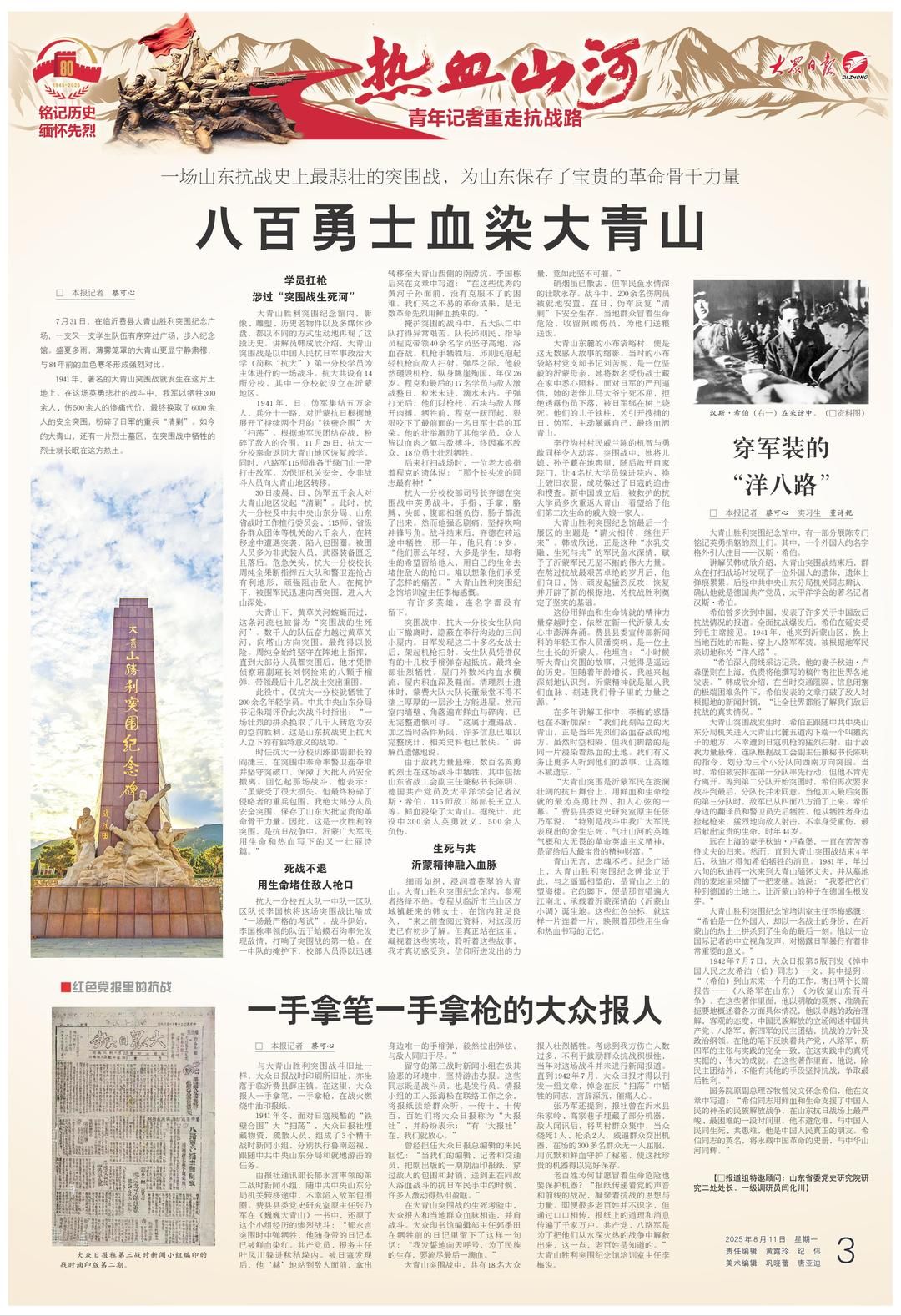 大青山突围战中,共有18名大众报人壮烈牺牲。考虑到我方伤亡人数过多,不利于鼓励群众抗战积极性,当年对这场战斗并未进行新闻报道。直到1942年7月,大众日报才得以刊发一组文章,悼念在反“扫荡”中牺牲的同志,言辞深沉,催痛人心。