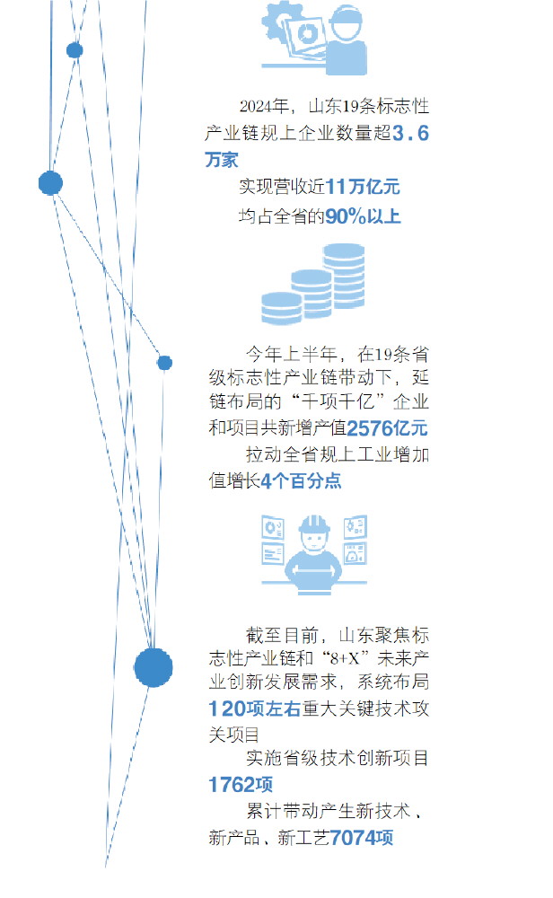 2024年,“链长制”升级优化,山东19条省级标志性产业链集聚规上企业数量超3.6万家、实现营收近11万亿元,均占全省九成以上。