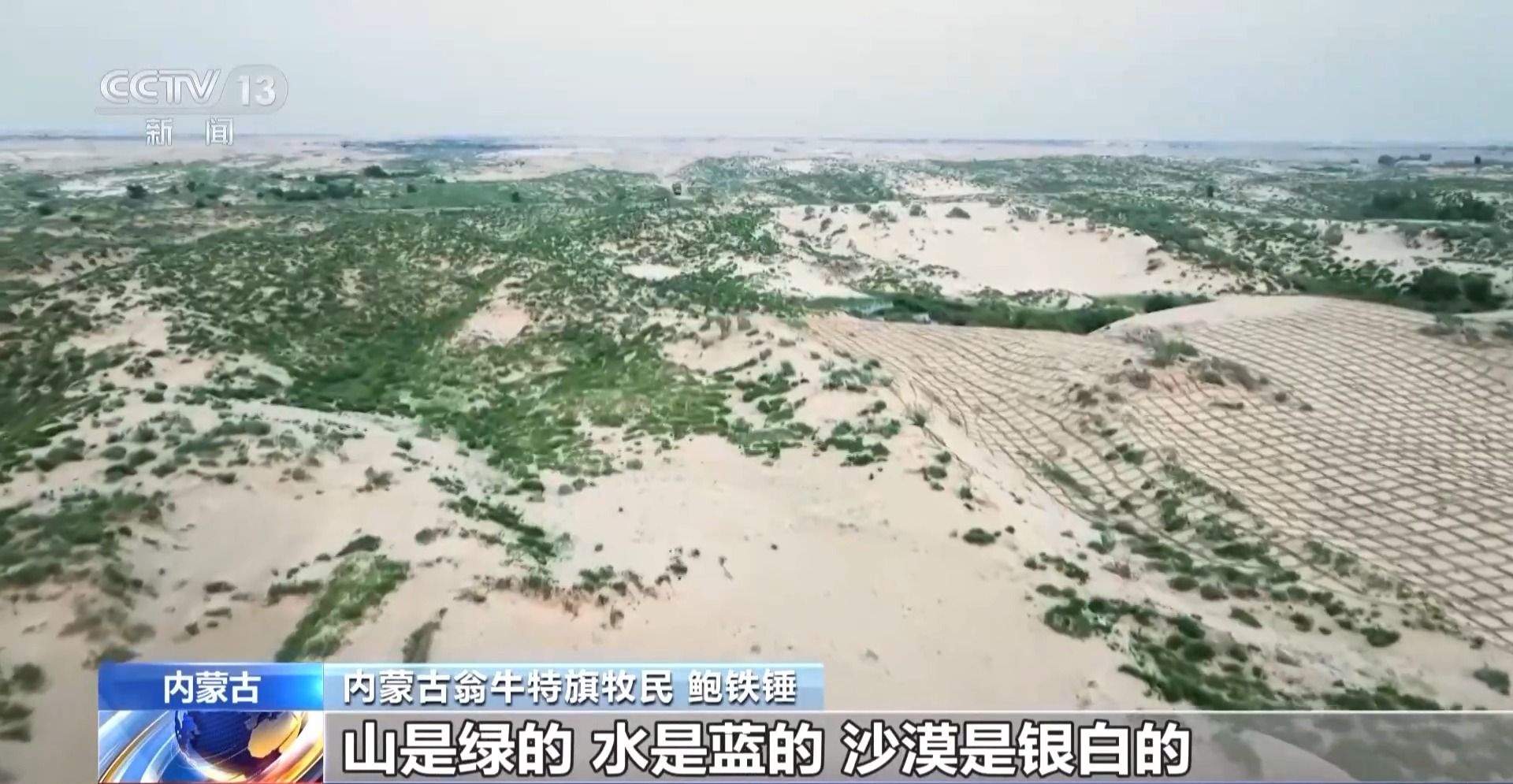 内蒙古翁牛特旗牧民 鲍铁锤:山是绿的,水是蓝的,沙漠是银白的,有玩的地方,有放牧的地方。