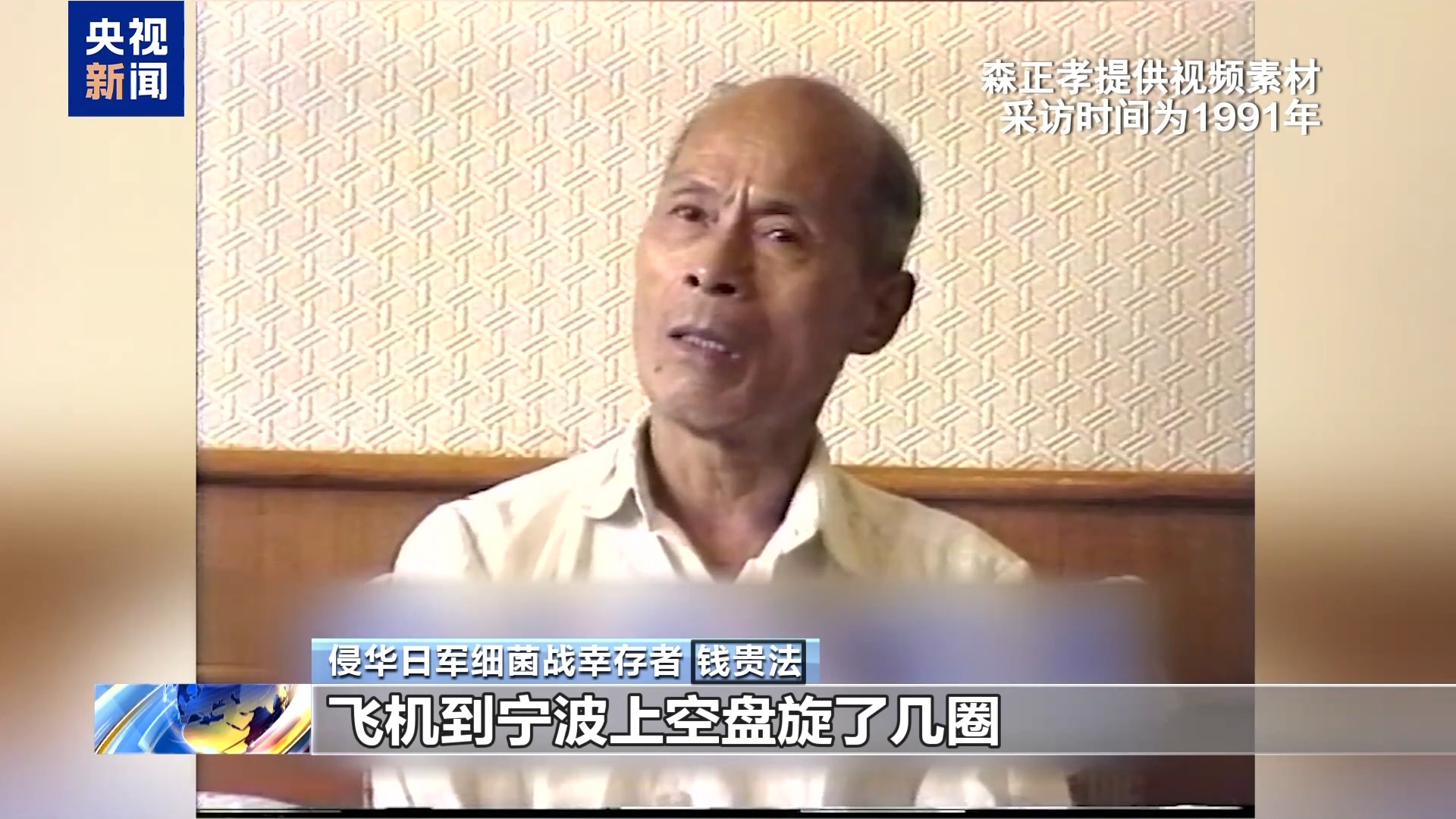 侵华日军细菌战幸存者 钱贵法:当时日本帝国主义、军国主义,飞机到宁波上空盘旋了几圈,在宁波市区盘旋以后,就到开明街的上空,飞机就降低了高度,飞得很低很低。然后有小麦,玉米掉下来,开明街一带烟雾腾腾,因此在第二天早上,我们就发现,卖豆腐的姓欧的家里,他们一下子死了,两个人死了。